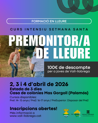 CURS DE PREMONITORS DE LLEURE amb 100€ de descompte per a joves de Vall-llobrega* Quan? Per setmana santa, els dies 2, 3 i 4 d’abril de 2026. Estada de 3 dies a la Casa de colònies Mas Gorgoll (Palamós)